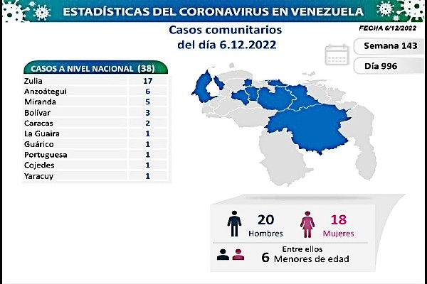 Informó que los 38 casos comunitarios están ubicados en: Zulia (17), Anzoátegui (6), Miranda (5) y Bolívar (3), Caracas 2, La Guaira 1, Guárico 1, Portuguesa 1, Cojedes 1 y Yaracuy 1, además, refiere que se trata de 20 hombres y 18 mujeres, 6 menores de edad entre ellos.