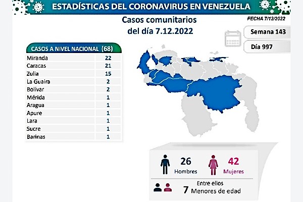 El estado Miranda encabezó el número de contagios con 22, le siguieron Caracas 21, Zulia 15, La Guaira 2, Bolívar 2. Asimismo, Mérida 1, Aragua 1, Apure 1, Lara 1, Sucre 1 y Barinas 1.