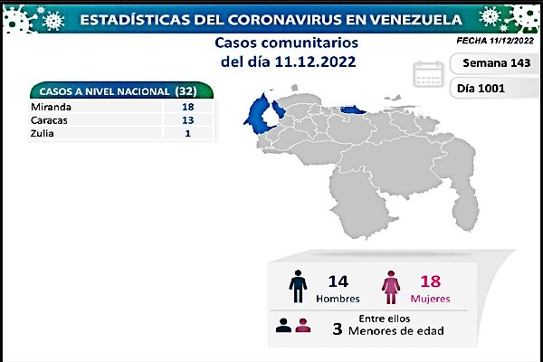 Informó que los 32 casos comunitarios están ubicados en: Miranda (18), Caracas (13) y Zulia (1).