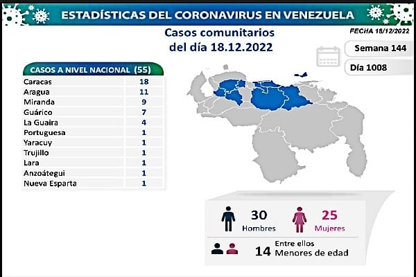 Los 55 casos por transmisión comunitaria se repatieron en 11 entidades del país. Caracas encabeza con 18; siguen Aragua con 11, Miranda con 9, Guárico 7, La Guaira 4, Portuguesa 1, Yaracuy 1, Trujillo 1, Lara 1, Anzoátegui 1 y Nueva Esparta 1,