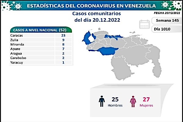 Informó que los casos comunitarios se encuentran ubicados en: Caracas (23), Zulia (9), Miranda (8), Apure (7), Aragua (2), Carabobo (2) y Yaracuy (1) .
