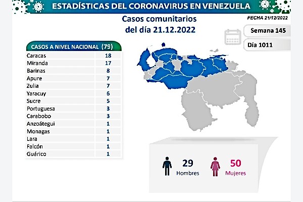 Los 79 casos por transmisión comunitaria se reparten en 14 entidades del país. Caracas encabezan la lista con 18 contagios. Le siguen Miranda con 17 y Barinas con 8, Apure y Zulia 7, Yaracuy 6. Lo mismo Apure 5, Portuguesa y Carabobo 3, Anzoátegui 1, Monagas 1, Lara 1 Falcón 1 y Guárico 1.