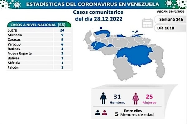 Los nuevos contagios comunitarios están ubicados en los estados: Sucre 24, Miranda 9, Caracas 9, Yaracuy 6, Barinas 3, Nueva Esparta 2, Bolívar, Mérida y Falcón con 1 cada uno.