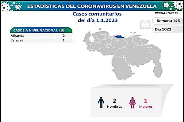 Miranda fue el estado donde este domingo primero de enero de2023 se registra la mayor cantidad casos comunitarios (2), con contagios activos en 2 municipios; seguido de Caracas con 1 nuevo caso.