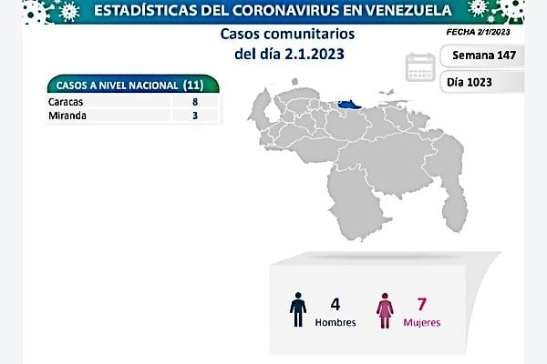 Señaló que los casos comunitarios están ubicados en los siguientes estados, Caracas con 8 casos y Miranda con 3 nuevos contagios.