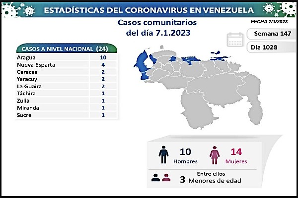 Informó que los casos comunitarios están ubicados en: Aragua (10), Nueva Esparta (4), Caracas (2), Yaracuy (2), La Guaira (2), Táchira (1), Zulia (1), Miranda (1) y Sucre (1).