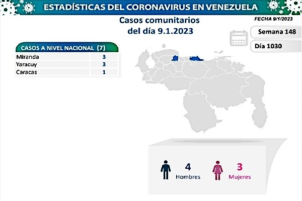 Indicó que los casos comunitarios están ubicados en los siguientes estados, Miranda y Yaracuy con 3 casos y Caracas registró un nuevo caso por covid-19. De estos 7 nuevos casos comunitarios, 4 son hombres y 3 son mujeres.