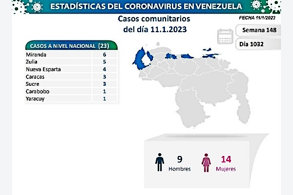 Venezuela completó este miércoles 11 de enero el día 1032 de pandemia de la covid-19 con un registro de 23 nuevos contagios, todos comunitarios. Así lo especificó en Twitter el vicepresidente sectorial de Comunicación, Cultura y Turismo, Freddy Ñáñez.
