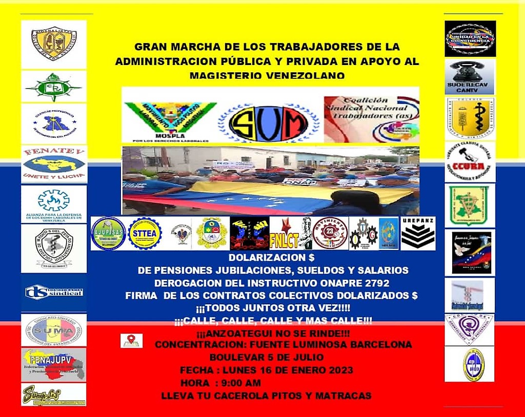 15 de enero de 2023.- A continuacion se presenta una muestra parcial de las convocatorias que circulan en las redes sociales de comunicación social y dirigidas a movilizar al Pueblo Trabajador a nivel nacional en Defensa de Salarios Dignos y por hacer respetar el Salario Minimo Nacional tal como lo establece el Articulo 91 de la CRBV: