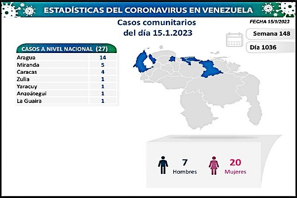 Informó que los casos comunitarios fueron ubicados en los estados: Aragua (14), Miranda (5), Caracas (4), Zulia, Yaracuy, Anzoátegui y La Guaira (1c/u).