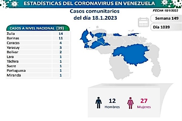 Informó que los casos comunitarios están ubicados en: Zulia 14, Barinas 11, Caracas 4, Yaracuy 3, Bolívar 2, Lara 1, Táchira 1, Sucre 1, Portuguesa 1 y Miranda 1.