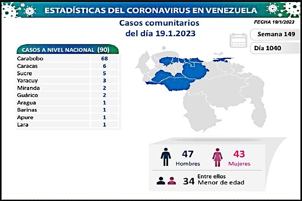 Indicó que los casos comunitarios están ubicados en: Carabobo (68), Caracas (6), Sucre (5), Yaracuy (3), Miranda (2), Guárico (2) , Aragua, Barinas, Apure y Lara con (1 c/u).