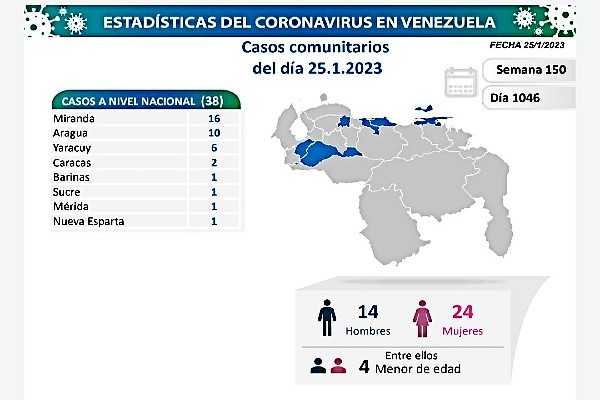 El Vicepresidente Sectorial de Comunicación, Turismo y Cultura, Freddy Ñáñez, informó a través de su cuenta de twitter @luchaalmada que, a 1046 días de la pandemia en Venezuela, anunciamos que el país registró 38 nuevos casos de #COVID19, todos de transmisión comunitaria.