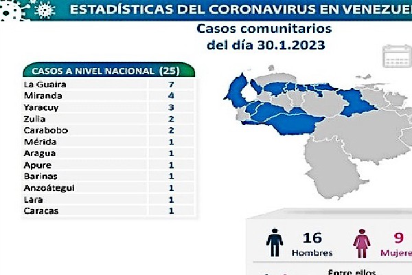 Informó que los casos comunitarios están ubicados en: La Guaira (7), Miranda (4), Yaracuy (3), Zulia (2), Carabobo (2) y Mérida, Aragua, Apure, Barinas, Anzoátegui, Lara y Caracas con (1 c/u).