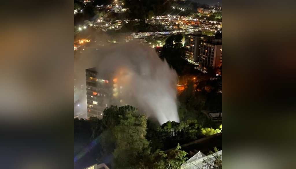 31-01-23.-En horas de la noche de este lunes 30 de enero se reventó una tubería matriz de Hidrocapital que distribuye el agua en San Antonio de Los Altos e impactó directamente en la fachada de la Torre B de las Residencias Los Altos.