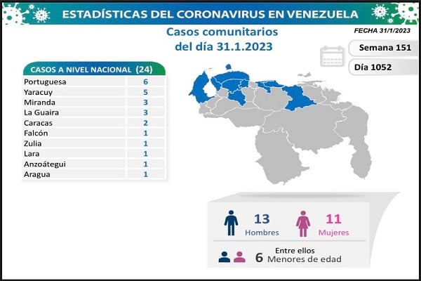 El estado Portuguesa registró el mayor número de nuevos casos comunitarios con 6, con contagios activos en 4 municipios: Páez (2), Ospino (2), Agua Blanca (1) y Araure (1).