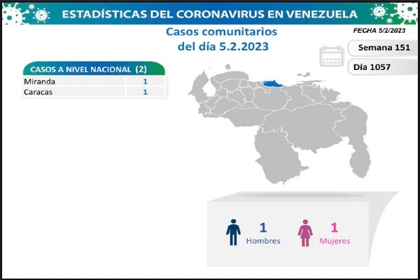 La Comisión Presidencial para la Prevención, Atención y Control de la covid-19 en Venezuela informó este domingo por la noche que en las últimas horas se detectaron apenas dos nuevos contagios en el país, (1 hombre y 1 mujer) ambos por transmisión comunitaria, estos casos correspondieron al día 1057 de la pandemia en Venezuela y se ubicaron en Miranda y Caracas.