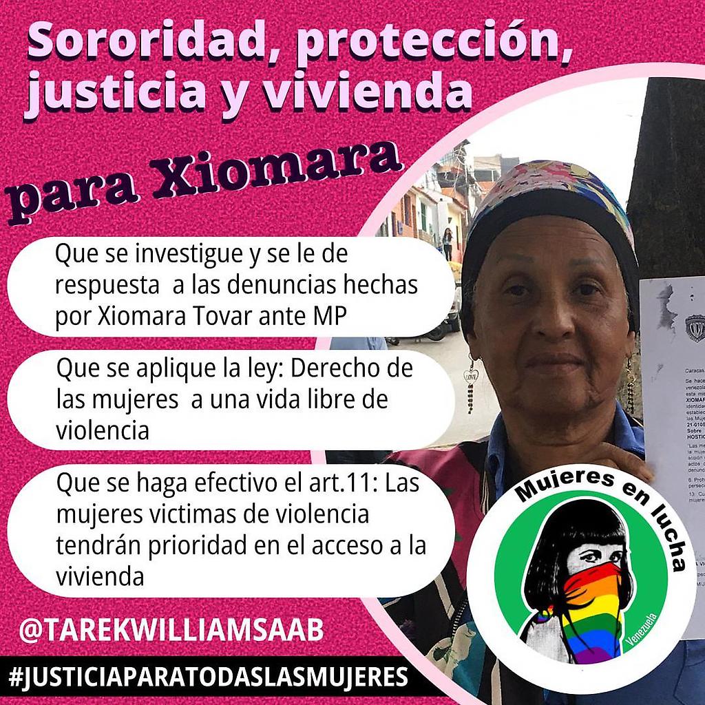 Invitamos a todas las mujeres, compañeros y aliades, referentes feministas y demás organizaciones que tienen por misión la defensa y promoción de los derechos de las mujeres, a sumarse a esta campaña en redes sociales, en solidaridad con Xiomara Tovar para exigir a las autoridades competentes, protección, justicia y vivienda digna, Xiomara cuenta con tu apoyo.