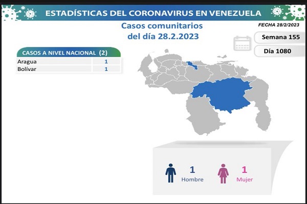Venezuela registró en las últimas horas dos nuevos casos de Covid-19, ambos por transmisión comunitaria en los estados Aragua y Bolívar, informó la vicepresidenta Ejecutiva de la República, Delcy Rodríguez, a través de la red social Twitter.