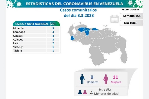 A 1083 días de la pandemia en Venezuela, notificamos que el país registró 20 nuevos casos de #Covid19 , todos de transmisión comunitaria, de esta manera lo indicó el Vicepresidente Sectorial de Comunicación, Turismo y Cultura, Freddy Ñáñez, a través de su cuenta de twitter @luchaalmada.