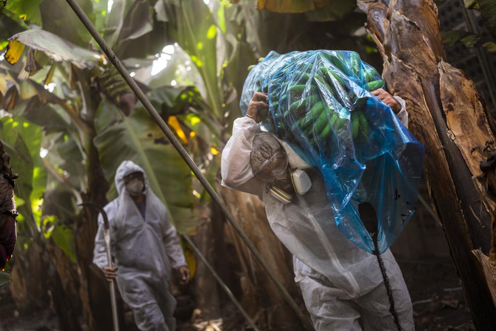 Antonio Álvarez carga un bulto de plátanos en una plantación en la isla de La Palma, España, el domingo 31/10/2021