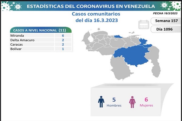 Informó que los casos comunitarios están ubicados en: Miranda (6), Delta Amacuro (2), Caracas (2) y Bolívar (1).