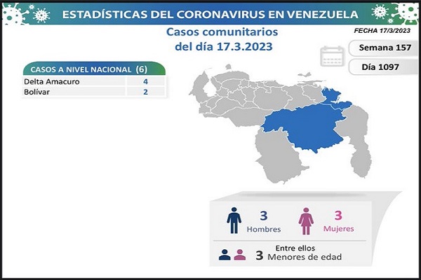 Informó que los casos comunitarios fueron ubicados en los estados Delta Amacuro (4) y Bolívar (2).