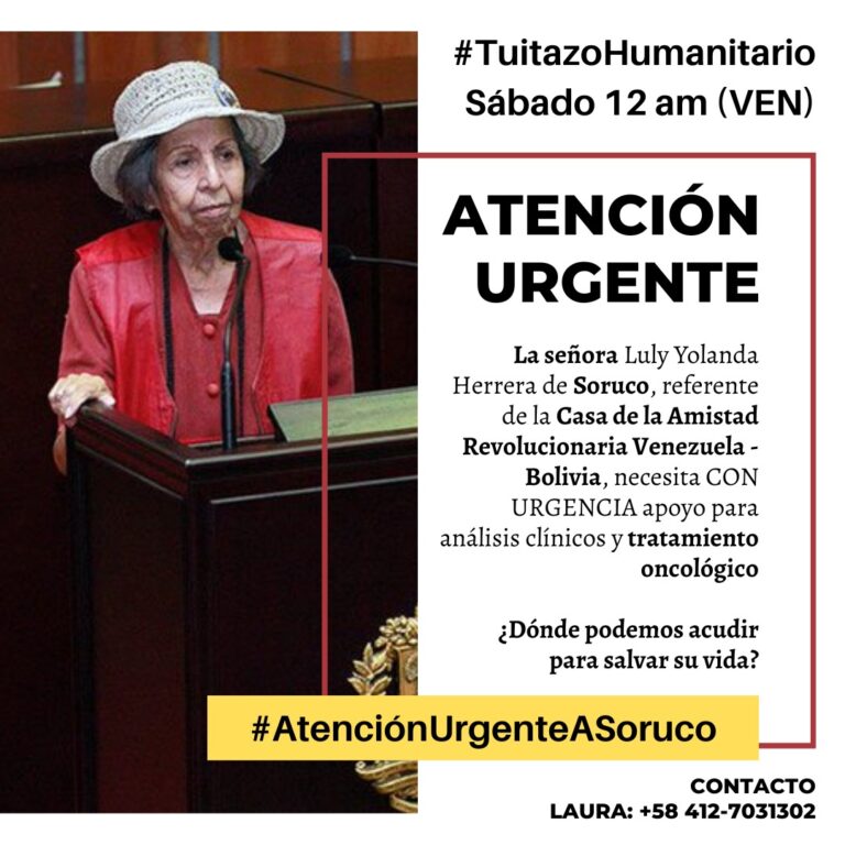La Sra. Luly Yolanda Herrera de Soruco es un referente de la Casa de la Amistad Revolucionaria Venezuela-Bolivia y necesita con URGENCIA apoyo para análisis clínicos y tratamiento oncológico. ¿A dónde podemos acudir para salvar su vida? @NicolasMaduro, @evoespueblo @jaarreaza