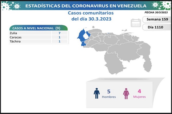 A 1.110 días de la pandemia en Venezuela por la covid-19, se reportan 9 nuevos contagios del virus, todos por transmisión comunitaria. Así lo informó la vicepresidenta Delcy Rodríguez.