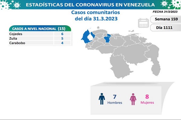 Informó que los casos comunitarios están ubicados en los estados: Cojedes (6), Zulia (5) y Carabobo (4).