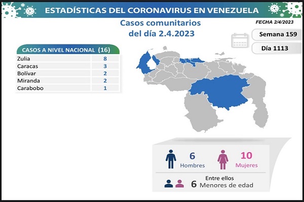 La Comisión Presidencial para la Prevención, Atención y Control de la covid-19 en Venezuela informó este domingo se detectaron 16 nuevos contagios en el país, todos por transmisión comunitaria, correspondientes al día 1113 de pandemia repartidos en cinco entidades.