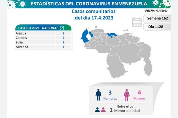 informó que en las últimas 24 horas el país registró 6 nuevos contagios, todos por transmisión comunitaria, indicó que A 1128 días de la pandemia en Venezuela, informamos que el país registró 7 nuevos casos, todos de transmisión comunitaria.