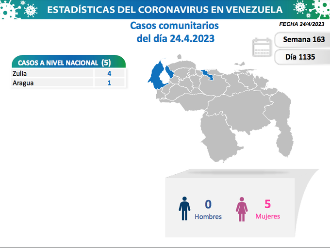 Informó que a 1.135 días de la pandemia en Venezuela, en las últimas 24 horas el país registró 5 nuevos contagios, todos por transmisión comunitaria.