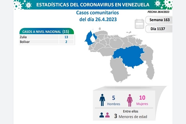 Ñáñez señaló que los casos comunitarios se encontraron ubicados en los estados: Zulia (13) y Bolívar (2).