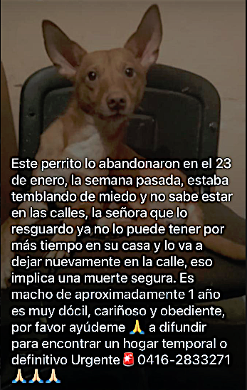 Este perrito busca un hogar fijo o temporal urgente, la persona que lo rescató no lo puede tener más y lo va a poner nuevamente en la calle donde no podrá sobrevivir, pues él no es callejero, él es un perrito abandonado que no sabe sobrevivir en las calles. A él le gusta caminar y jugar, apenas tiene un año de edad, necesita del calor de un hogar y mucho amor y a cambio ofrece también mucho amor alegría y compañía.