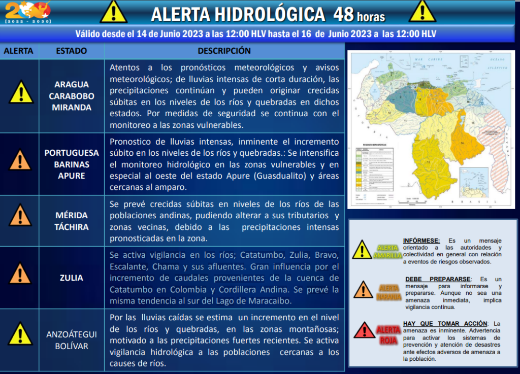 Mientras que, en los estados Mérida y Táchira se prevé crecidas súbitas en niveles de los ríos que podrían alterar a sus tributarios y zonas vecinas, debido a las precipitaciones intensas pronosticadas en la zona.