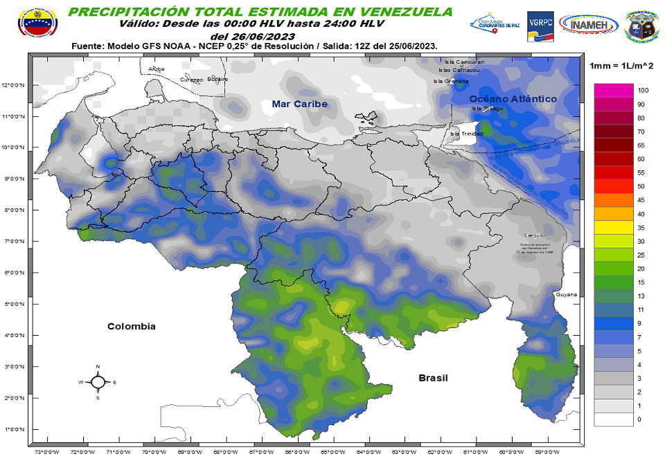 26 de junio de 2023.- Venezuela amanece con núcleos convectivos productores de lluvias o chubascos, algunos acompañados de actividad eléctrica (destellos azules) y ocasionales ráfagas de viento en áreas de Zulia, Trujillo, Guárico, Apure, este de Barinas y sur de Cojedes, Amazonas, Bolívar y el Esequibo.