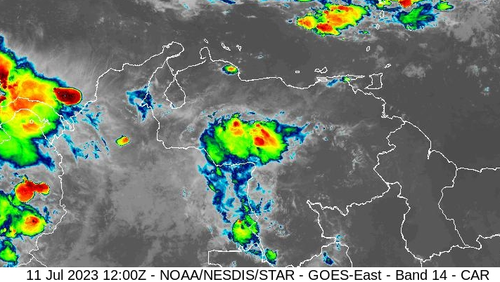 11 de julio de 2023.- La Onda Tropical N°17 del centro al occidente del país, interactúa con la Zona de Convergencia Intertropical, generando áreas nubladas con chubascos tormentosos en el Zulia, los Andes, Llanos Occidentales, Bolívar, Amazonas y el Esequibo; de igual modo, no se descartan algunas lluvias o lloviznas en áreas de Centro Norte Costero, Nororiente, Delta Amacuro, Nueva Esparta y este de Falcón. Motivado al aporte de humedad de los vientos Alisios del noreste.