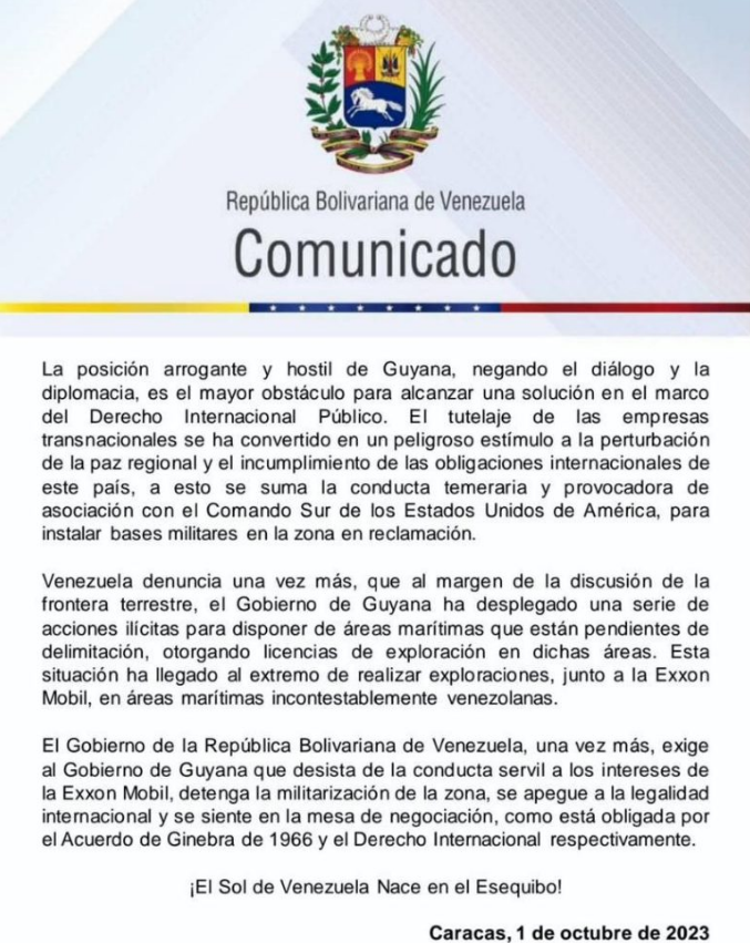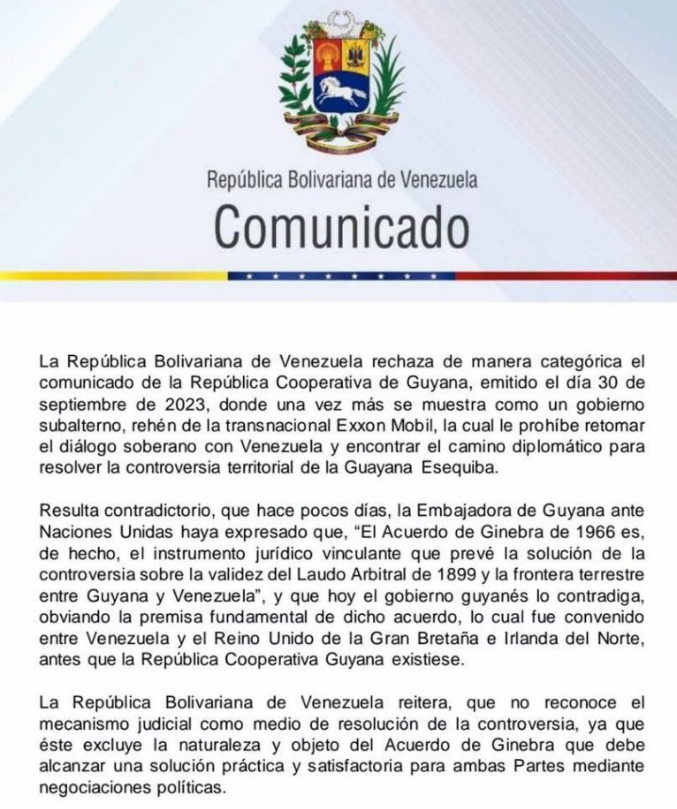 La República Bolivariana de Venezuela rechaza el comunicado emitido por la República Cooperativa de Guyana, el 30 de septiembre, en el que pretende desconocer el Acuerdo de Ginebra de 1966, y le exige al gobierno guyanés que desista de la conducta servil a los intereses de la Exxon Mobil.