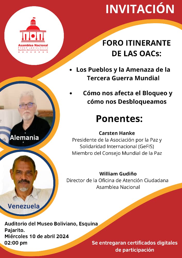 Carsten, que también forma parte del Consejo Mundial de la Paz, con sede en Grecia, disertará sobre estas afirmaciones en su ponencia "¿Estamos ante la III Guerra Mundial", que se llevará a cabo este miércoles 10 de abril en el Museo Boliviano de la Asamblea Nacional junto a Wuiliam Gudino, director de Atención Ciudadana del Parlamento.