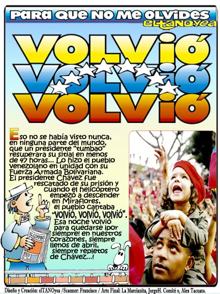 A comienzo de la tarde del 13 de abril de 2002 empezaron a pasar por la autopista vehículos desde donde la gente gritaba ¡Viva Chávez..! Entonces clavamos una pancarta en la pared y empezamos a pintar "¡Viva Chávez!, ¡Viva la República Bolivariana de Venezuela..!", es decir, los dos elementos que ellos creían haber eliminado con su golpe y que ahora con Ninoska, Argenis y Alex Tacuato estábamos comenzando a pintar, oliendo que la íbamos a tener que llevar a Miraflores.