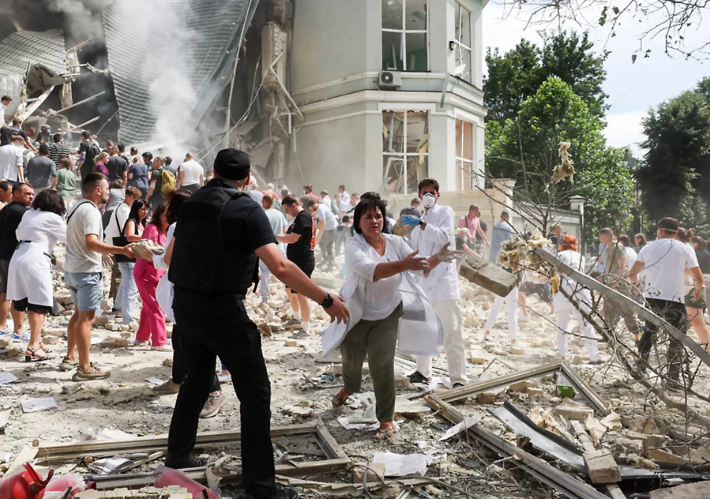 Los vídeos de la escena del hospital infantil mostraban a voluntarios trabajando con la policía y los servicios de seguridad para revisar los escombros mientras el humo salía del hospital, mientras el personal describía cómo intentaban llevar a los niños a un lugar seguro tras el ataque. El ministro de Salud de Ucrania, Viktor Liashko, dijo que las unidades de cuidados intensivos, los departamentos de oncología y las unidades de cirugía habían resultado dañados.