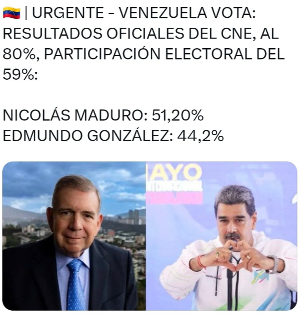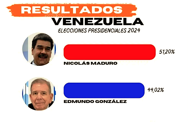 Caracas, 29 de Julio de 2024. Nicolas Maduro, candidato del Gran Polo Patriótico, ganó las elección presidencial de este domingo 28 de julio de 2024, con 5 millones 150 mil 092 votos que representa el 51.20 % de las boletas, anunció Elvis Amoroso, presidente del Consejo Nacional Electoral (CNE), al presentar el primer boletin con el 80% de los datos transmitidos que muestra una tendencia irreversible y contundente. Los resultados leídos por Amoroso señalan que Nicolás Maduro, del Gran Polo Patriótico, obtuvo 5.150.092 votos que implican el 51,20% y Edmundo González Urrutia con 4.445.978 votos el 44,2%.