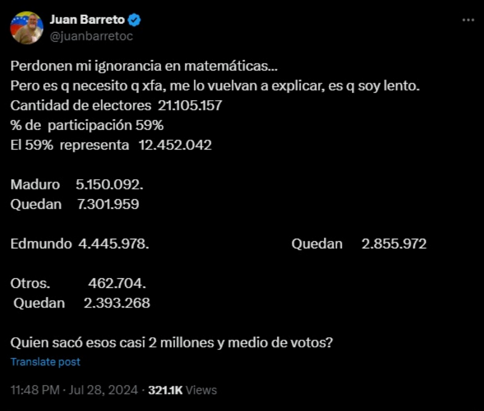 Al hacer sus propios cálculos, señala que aún hay 2.393.268 votos que no se han contado. «¿Quién sacó esos casi 2 millones y medio de votos?», preguntó Barreto.