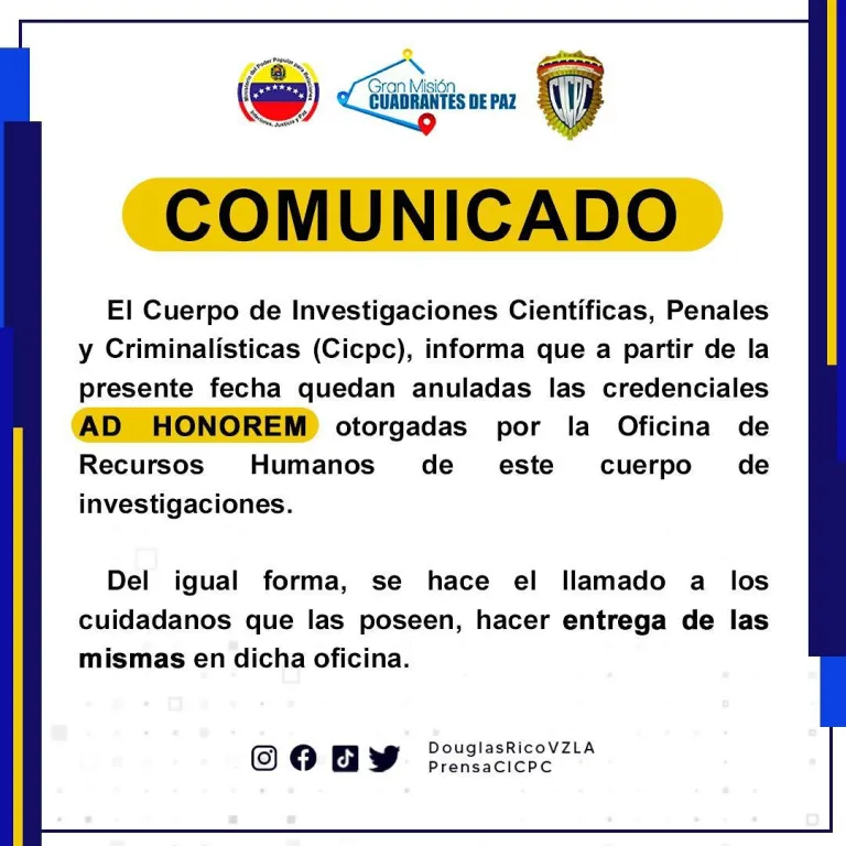 A través de una publicación en su cuenta de Instagram, el director del Cicpc, Douglas Rico, compartió un comunicado en el que informan que las credenciales Ad Honorem otorgadas por la oficina de Recursos Humanos de la entidad quedan anuladas.