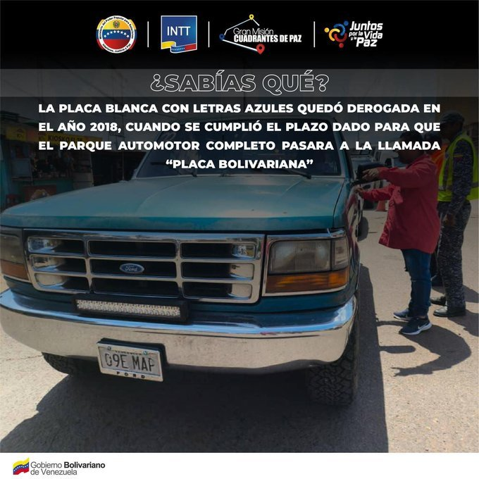 Así lo dio a conocer en su cuenta en X, donde detalla que las placas de letras azules “quedaron derogadas en el año 2018, cuando se cumplió el plazo dado para que el parque automotor completo pasara a la llamada ‘Placa Bolivariana’”