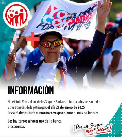"¡Atención pensionada y pensionado! El IVSS informa que el próximo pago de pensión correspondiente al mes de febrero, se realizará el día martes 21 de enero. ¡Te invitamos a hacer uso de la banca electrónica!", se lee en la publicación de su canal de Telegram.