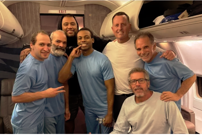 Poco antes, Grenell había publicado en la misma red social una fotografía de seis hombres vestidos de azul, sonrientes en el interior de un avión, pero sin revelar detalles de sus identidades, las razones por las cuales estaban detenidos en el país sudamericano o los cargos que enfrentaban.