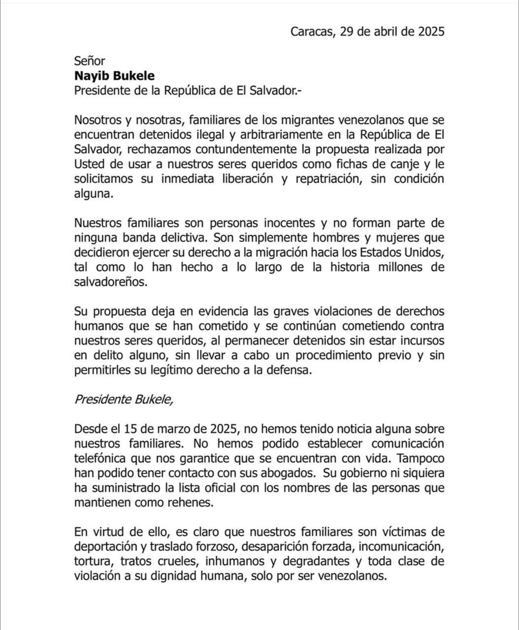 Los familiares de los venezolanos secuestrados en El Salvador por el gobierno de Nayib Bukele, enviaron una comunicación a este mandatario donde expresaron su rechazo a la propuesta ilegal de "canje" realizada por él y, a la vez, exigieron "su inmediata liberación y repatriación, sin condición alguna".