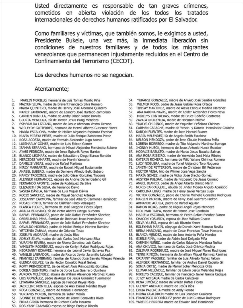 (+Carta) Familiares de venezolanos secuestrados por Bukele en El Salvador rechazan propuesta de "canje"